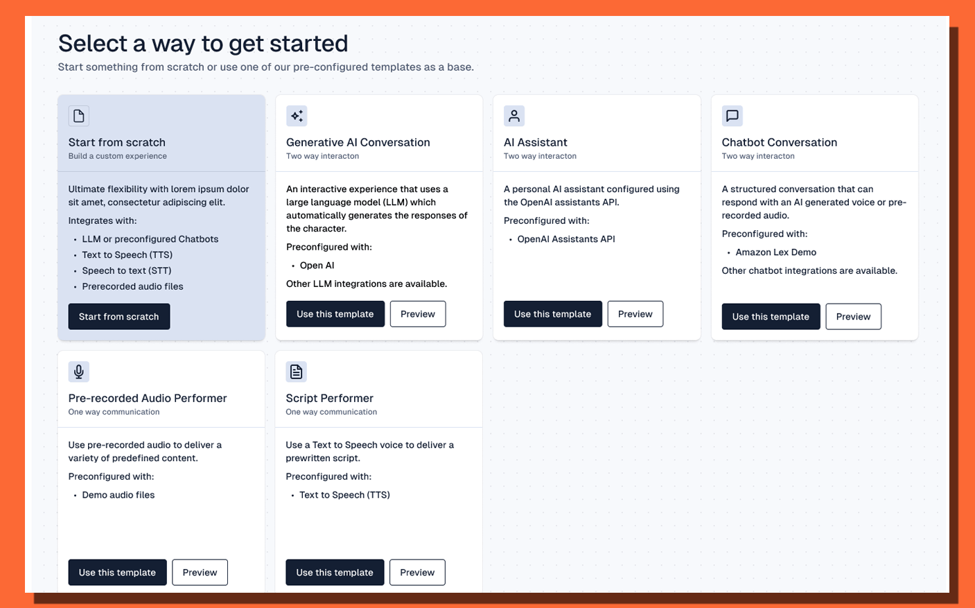 Combining AIs, large language models, text-to-speech, speech-to-text, and other technologies may seem daunting. That is why the Rapport platform comes with a number of pre-configured templates to help users get up and running in no time. Users can either build a custom experience from scratch or pick from a number of different conversational models or one-way communication methods.